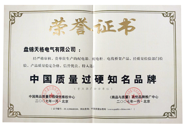 天格電氣2005年被評(píng)為“遼寧省行業(yè)百?gòu)?qiáng)企業(yè)”、“遼寧省信譽(yù)知名企業(yè)”等榮譽(yù)稱號(hào);2007年天格電氣企業(yè)被授予“中國(guó)質(zhì)量過(guò)硬知名品牌”稱號(hào)。